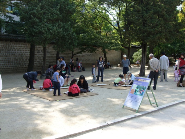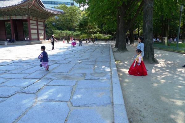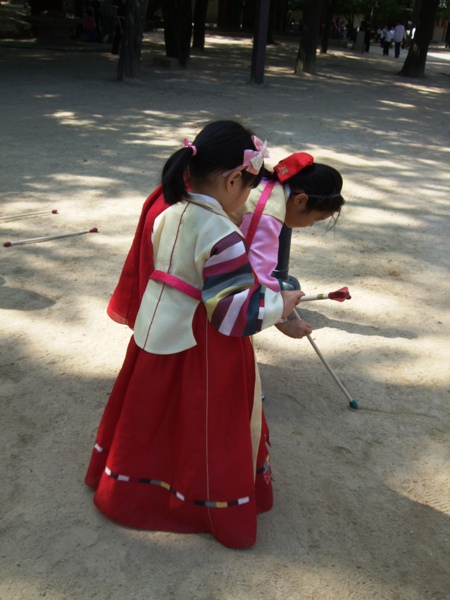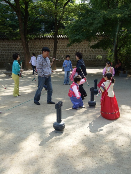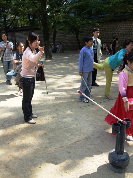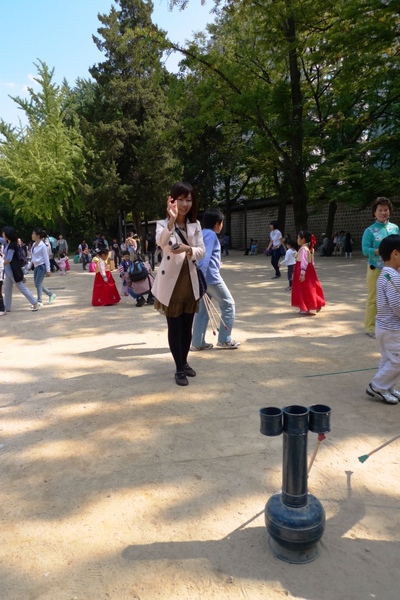 到了德壽宮看到好多韓國家庭一家大小出遊,韓國父母也都喜歡把小孩穿上傳統韓服帶出來,裡面還一些韓國傳統的遊戲,我跟Winnie也去跟小朋友搶了小東西來玩,就是把一支很像大隻的火柴棒丟進一個鐵孔裡面,還有打葫蘆踢毽子之類的。